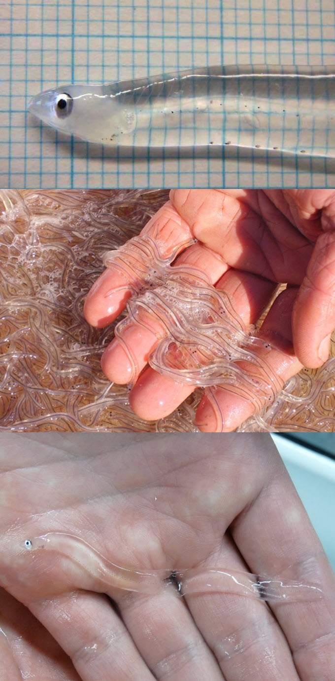 While most people believe that the Glass eel is a separate species, the glass eel is actually an immature European eel, Anguilla anguilla. When they mature, they'll be an ordinary eel.