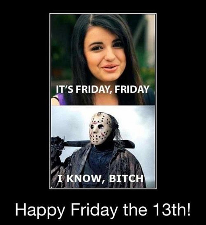 It's friday, friday. I know, bitch! Happy friday the 13th :) Friday the 13th is an American horror franchise that comprises twelve slasher films, a television show, novels, comic books, and tie‑in merchandise. The franchise mainly focuses on the fictional character Jason Voorhees, who drowned as a boy at Camp Crystal Lake due to the negligence of the camp staff.