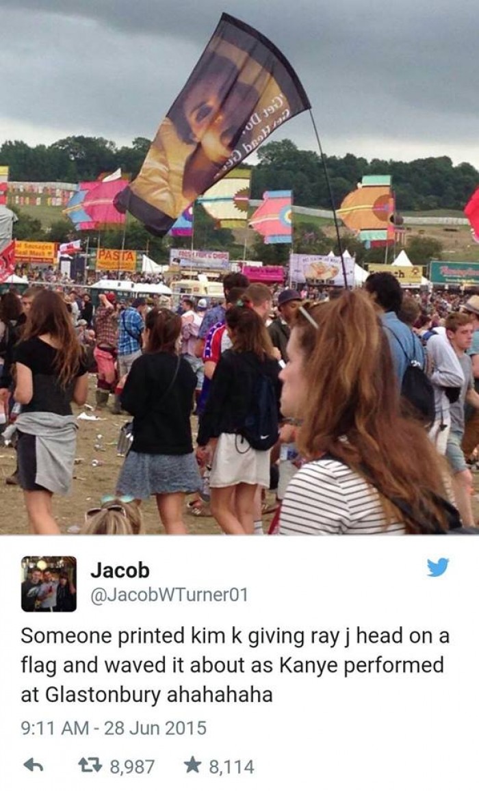 Someone printed Kim Kardashian giving Ray J head on a flag and waved it about as Kanye preformed at Glastonbury.